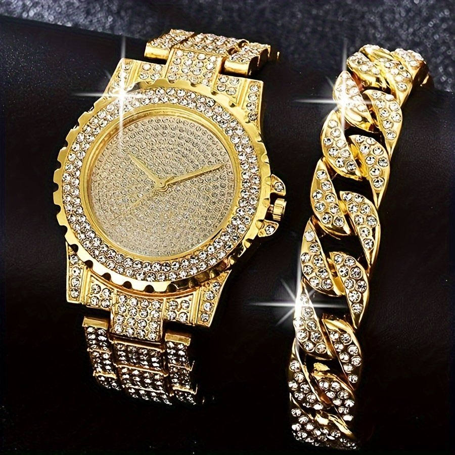 Two-piece Watch and Bracelet Set, Luxury Quartz Watch with Rhinestones, Fashionable Outfit Set, TOOP