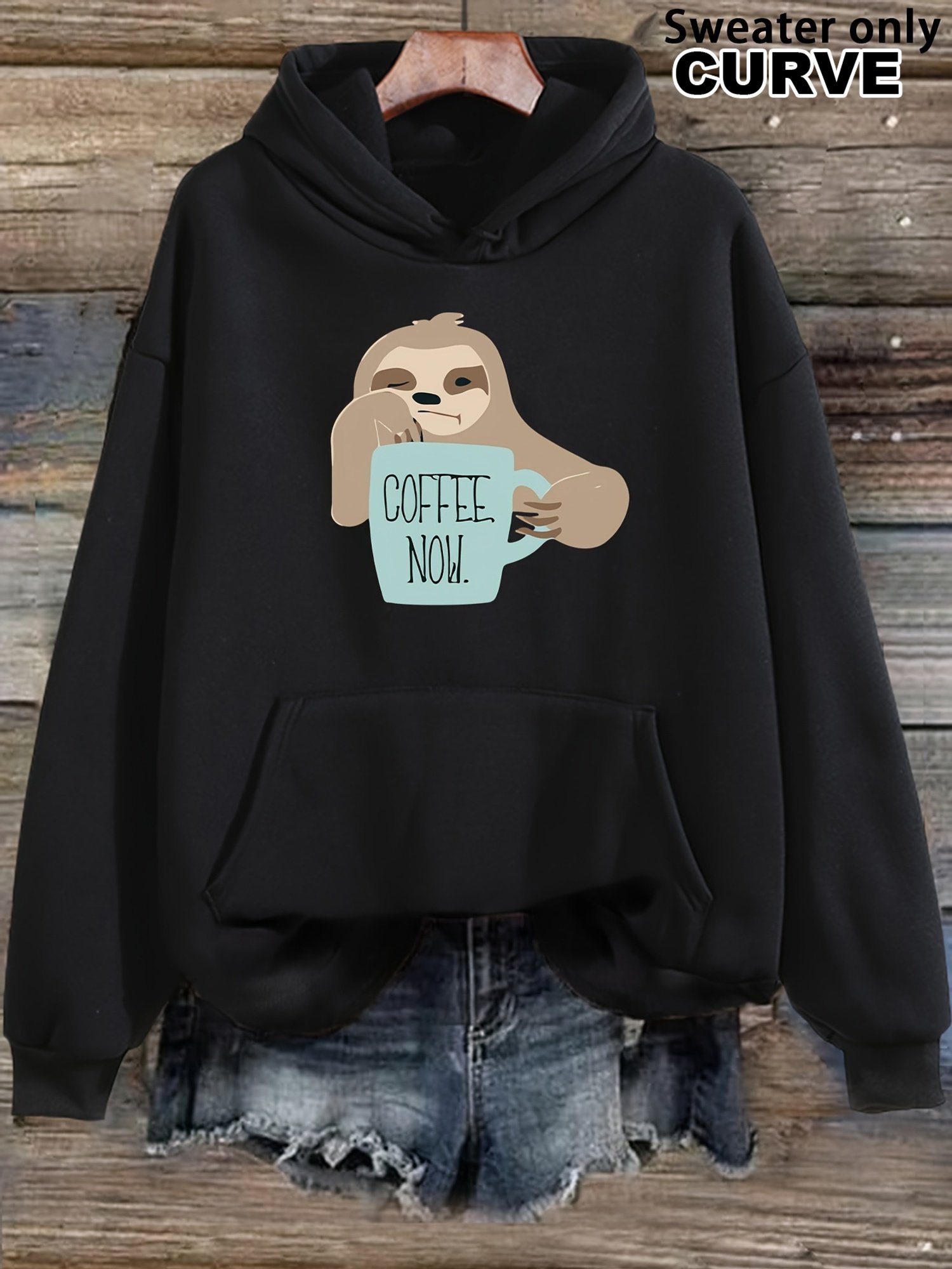 Women’S Casual Hoodie with Geometric Sloth Print, Polyester 100% Knit Fabric, Slight Stretch, Fall/Winter Pullover with Pocket Detail, 220g/m² Weight
