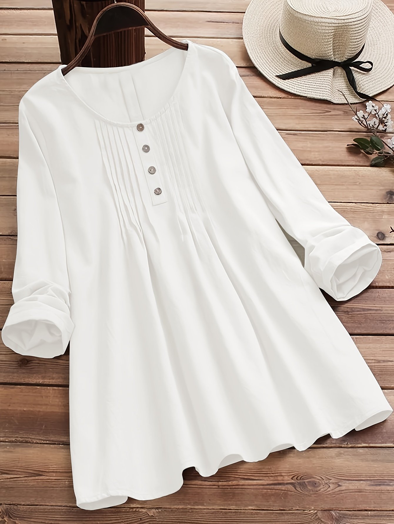 Women’s Casual Solid Color Blouse with Faux Button Detail – Crew Neck, Long Sleeve, Stretchy Polyester & Spandex Blend, Machine Washable – Perfect for Spring/Summer/Fall