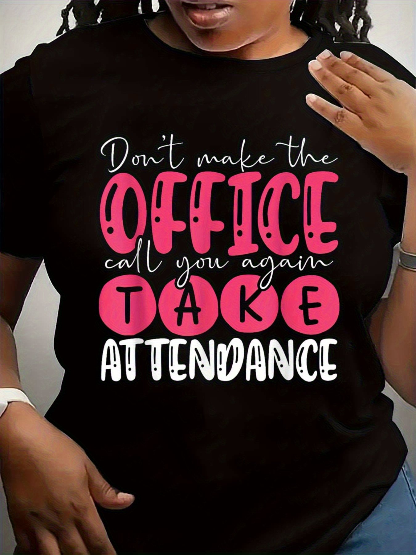 Women’s “Don’t Make the OFFICE Call You Again TAKE ATTENDANCE” Graphic T-Shirt – Black with Pink & White Lettering, Casual Round Neck Short Sleeve, Machine Washable All-Season Comfort, Humorous Shirt, Relaxed Fit Tee, Easy Care Top, Work Humor, Print Design, Durable Construction, Funny Tee, Office Workers