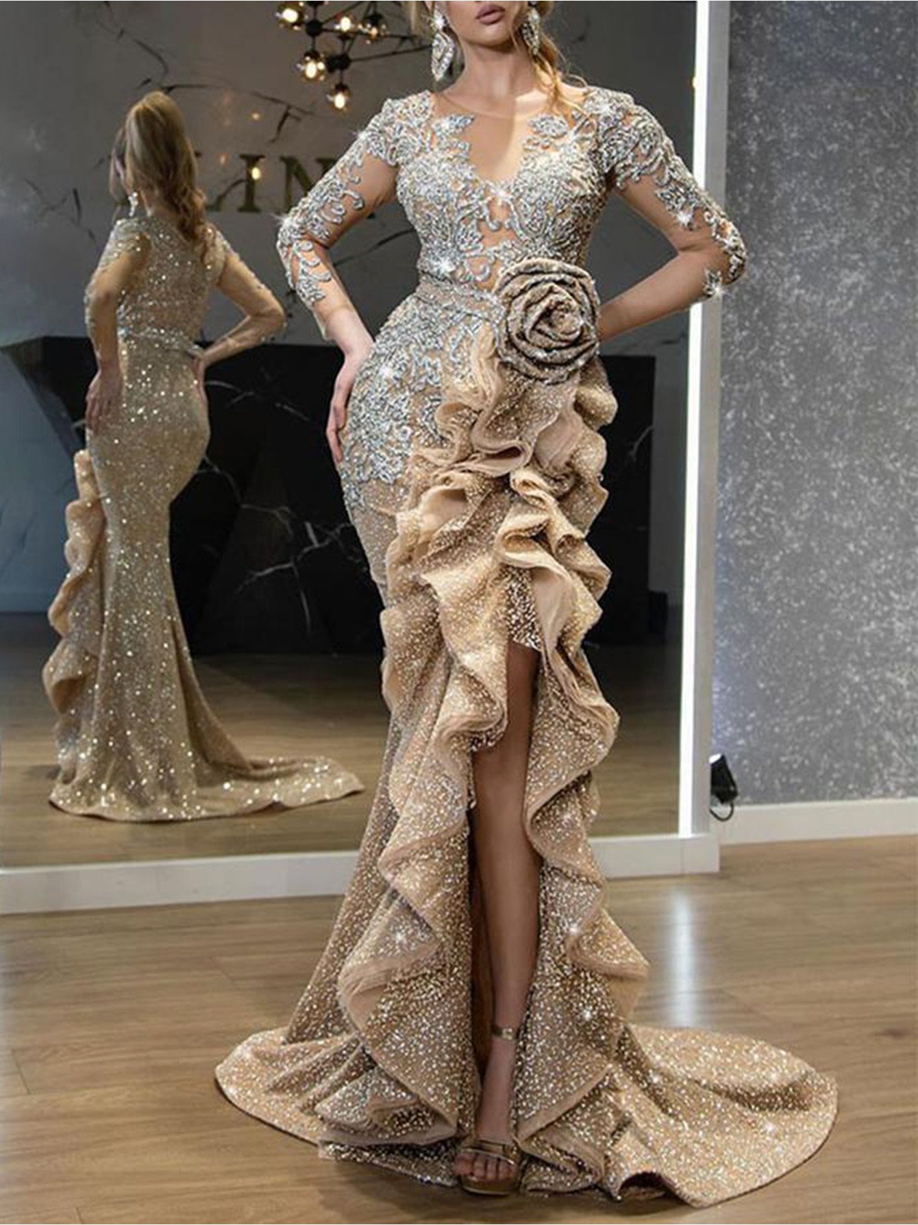 womens elegant sexy 3d floral draped long sleeve evening dress with sequin panel mermaid pencil silhouette round neck golden glitter accent floor length formal party wedding gala dress for autumn winter 2025 solid color no pattern luxury statement dress elegant special occasion with polyester materials designed for adult use in elegant clothing products the color of the fishtags to descriptive concernrais kinds
