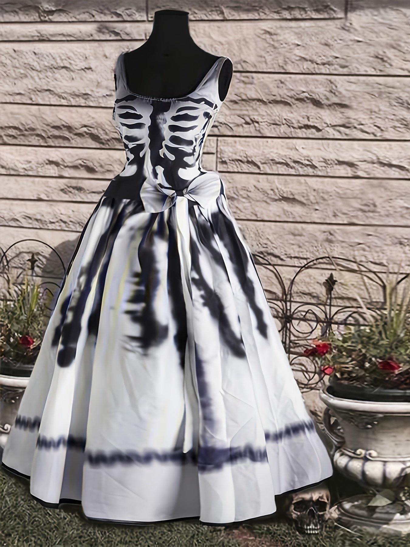 Women’s Gothic Victorian Style Sleeveless Maxi Dress with Bone Print & Ruffled Hem – A-Line Silhouette, Square Neckline & Large Bow Waist – Machine Washable White/Black/Gray/Blue/Purple Dress for Halloween Parties, Themed Events & Casual Attire – Retro-Inspired Gothic Outfit with Bone Motif, Flowing A-Line Skirt, and Structured Bodice for Spring/Summer/Fall Wear