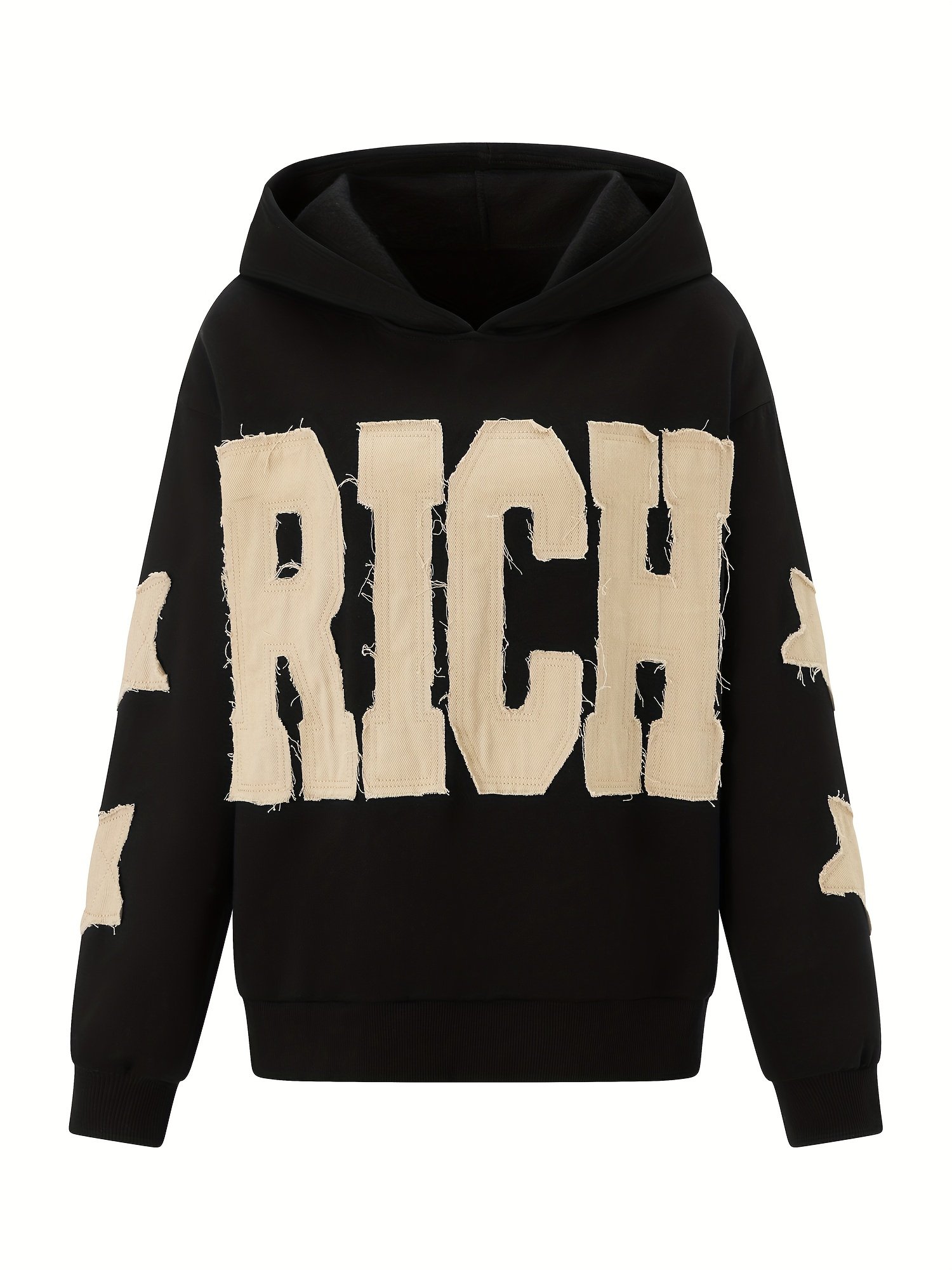 Women’s Oversized Hooded Sweatshirt with Bold White ‘RICH’ Lettering – Black & White Distressed Pullover, Long Sleeve Casual Fall/Spring Sweater, Medium Stretch Round Neck Hoodie for Casual Attire & Statement Outfits, Relaxed Fit with Drawstring Hood, Hand Wash or Dry Clean, Solid Color with Lettering Design, Chic and Comfortable for Layering, Womens Hoodies